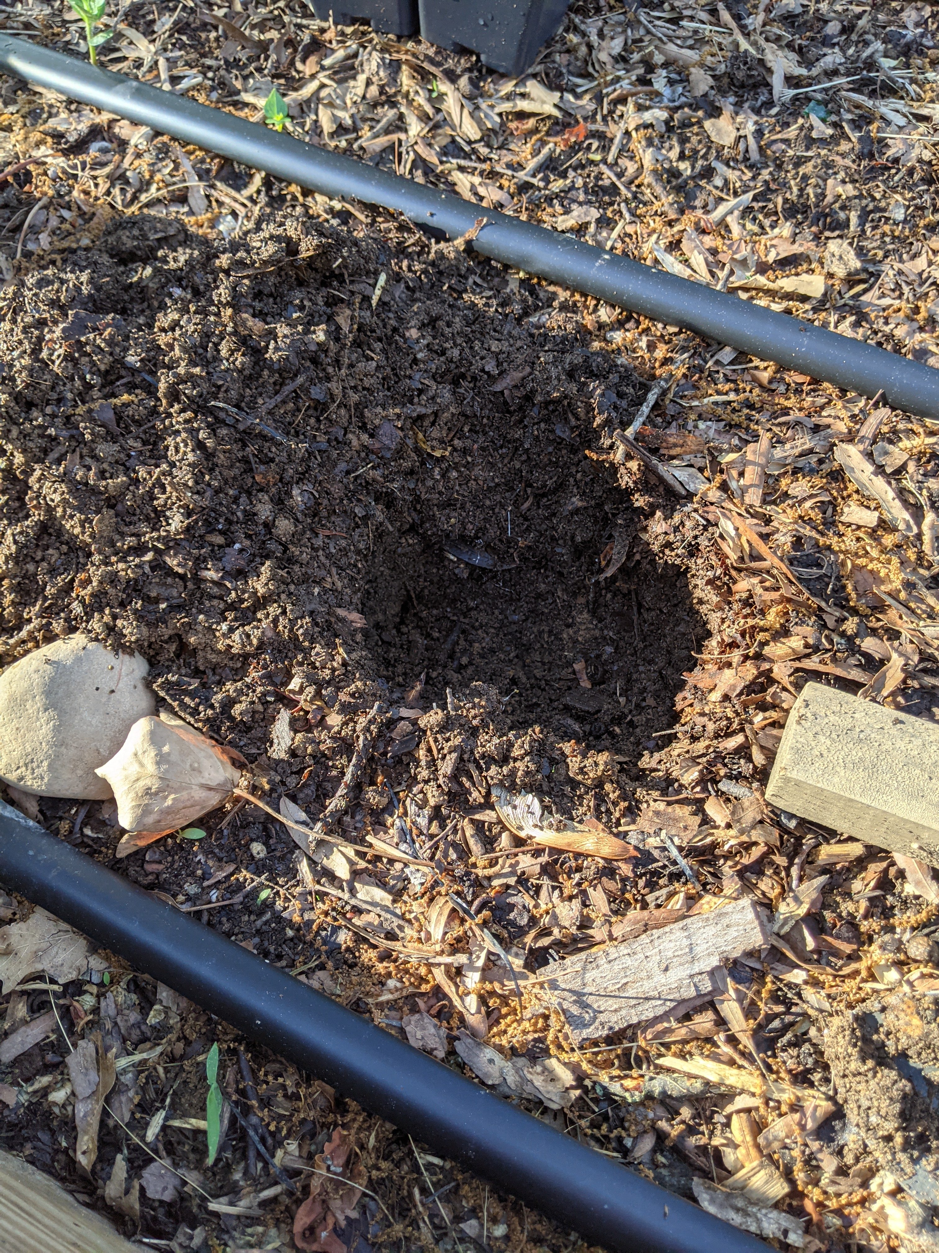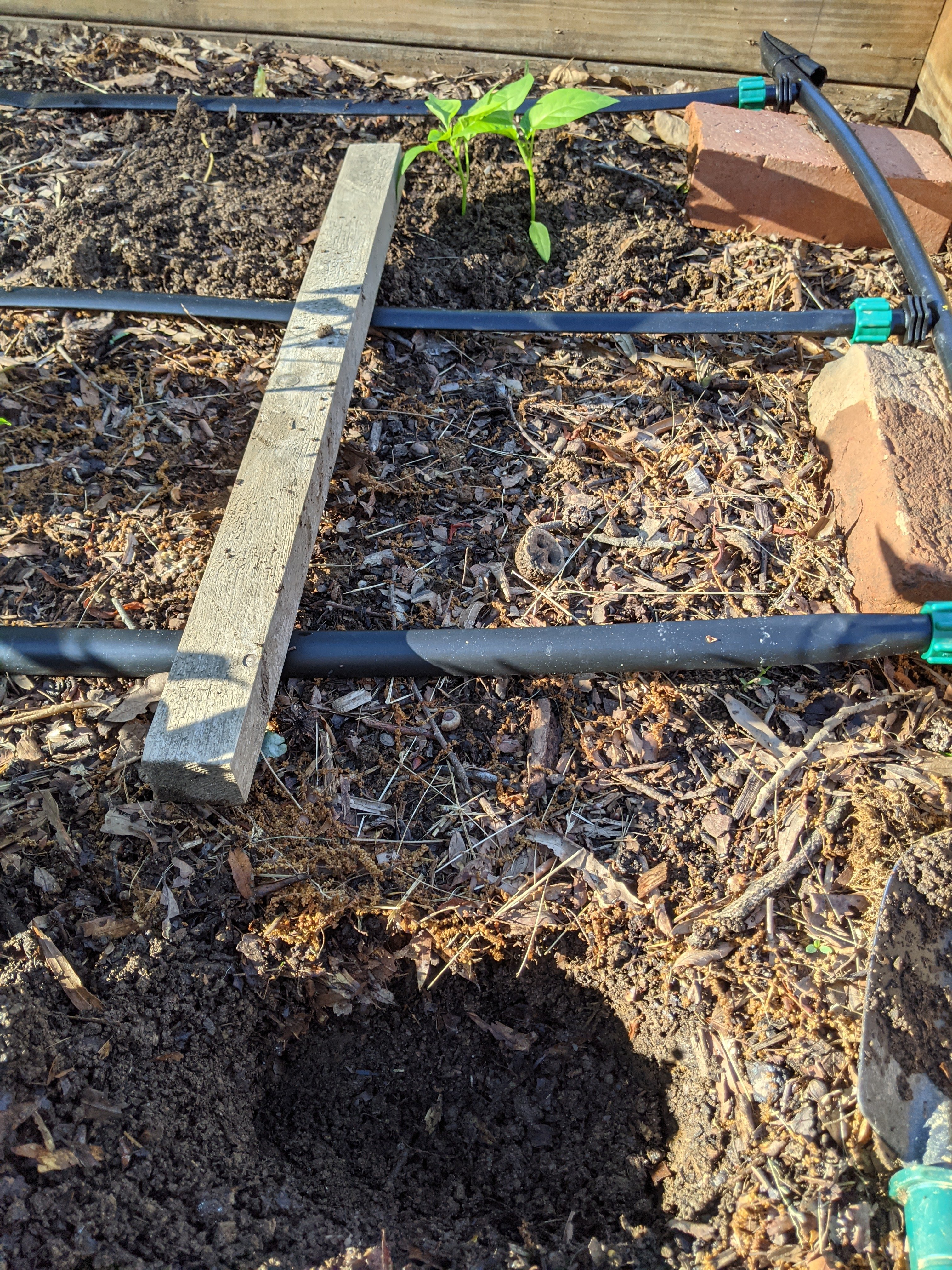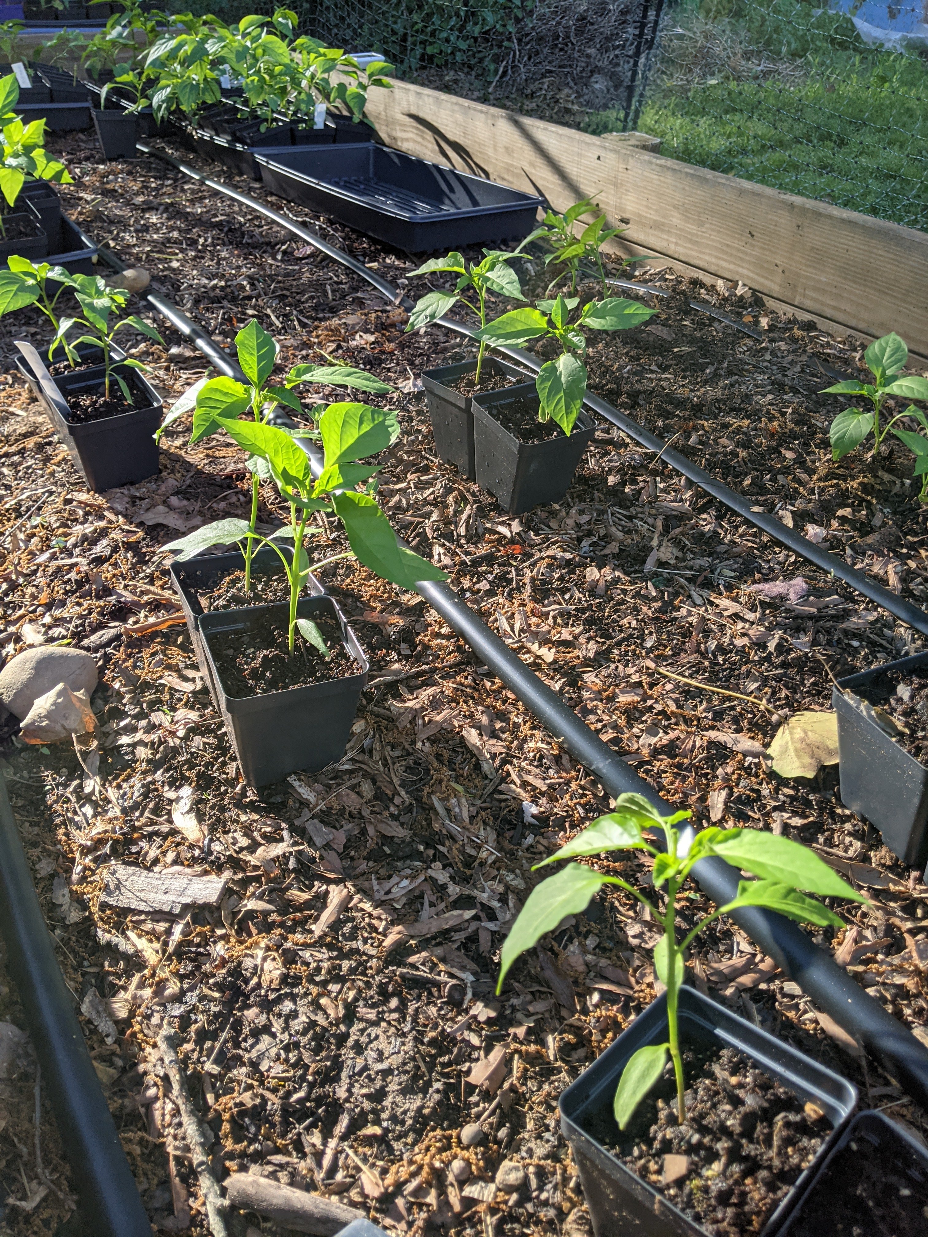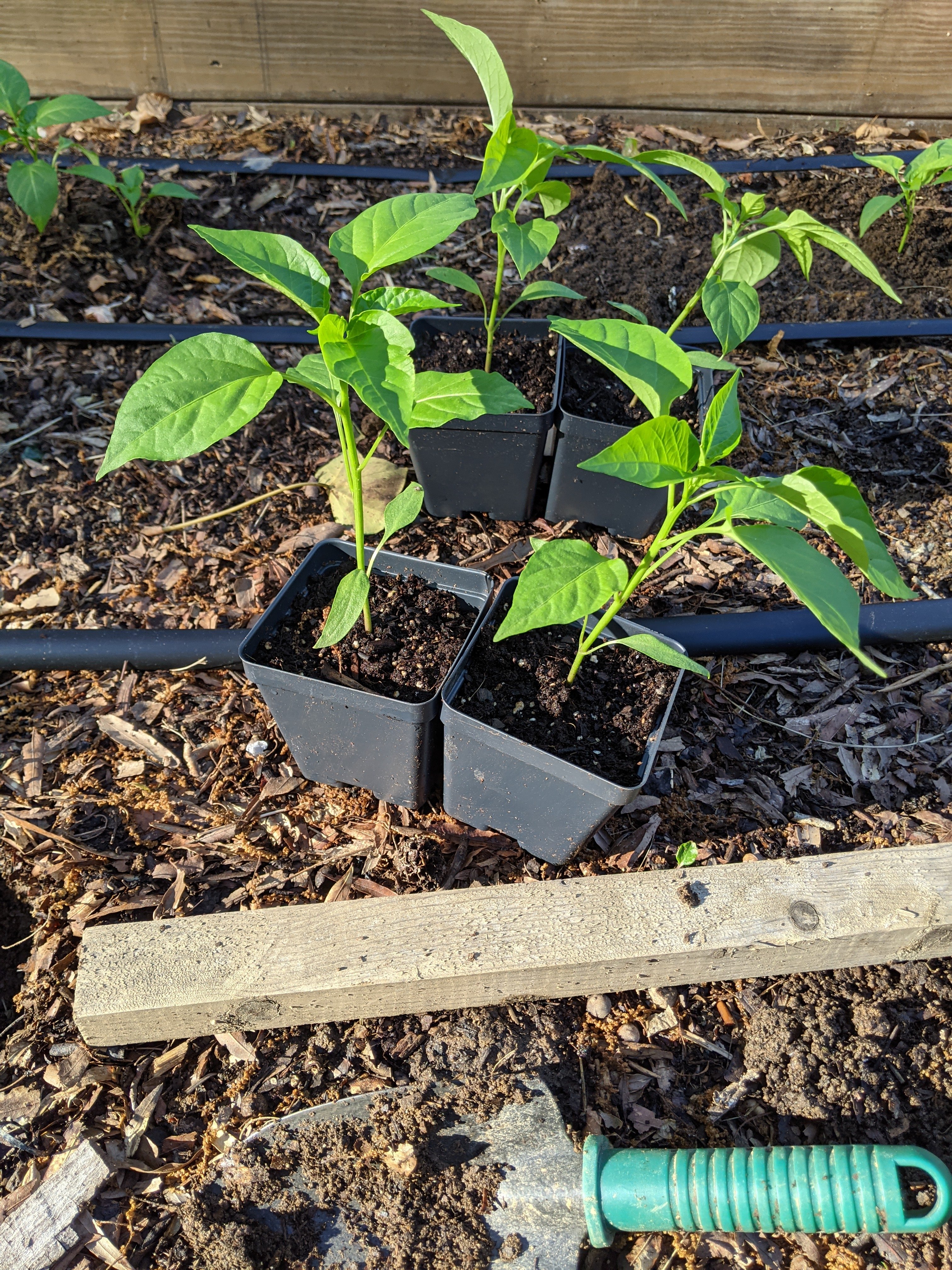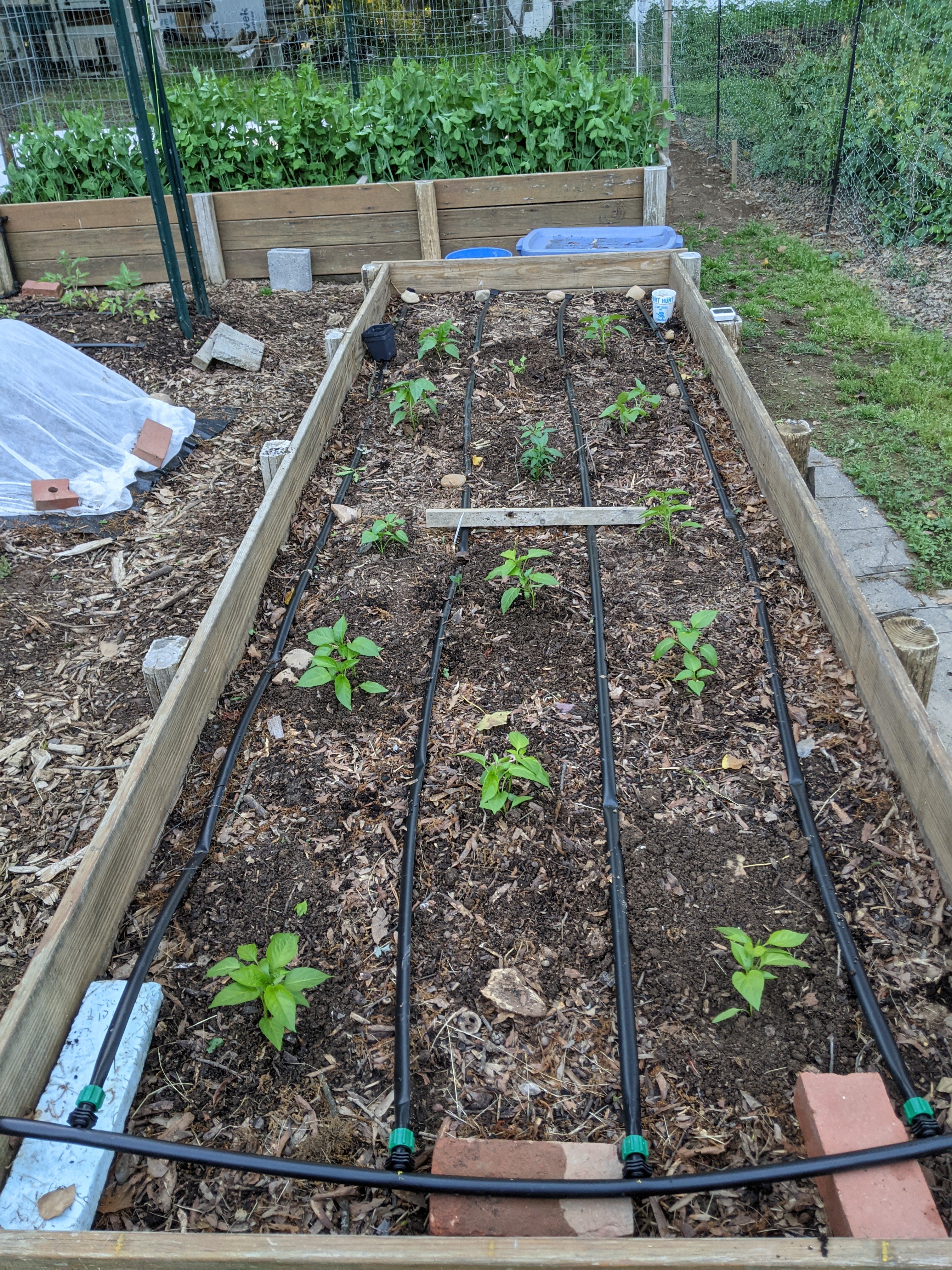 Planting Hatch peppers in a raised bed with drip tape. Next we will put in T posts and run string weaving through the plants to hold them up.