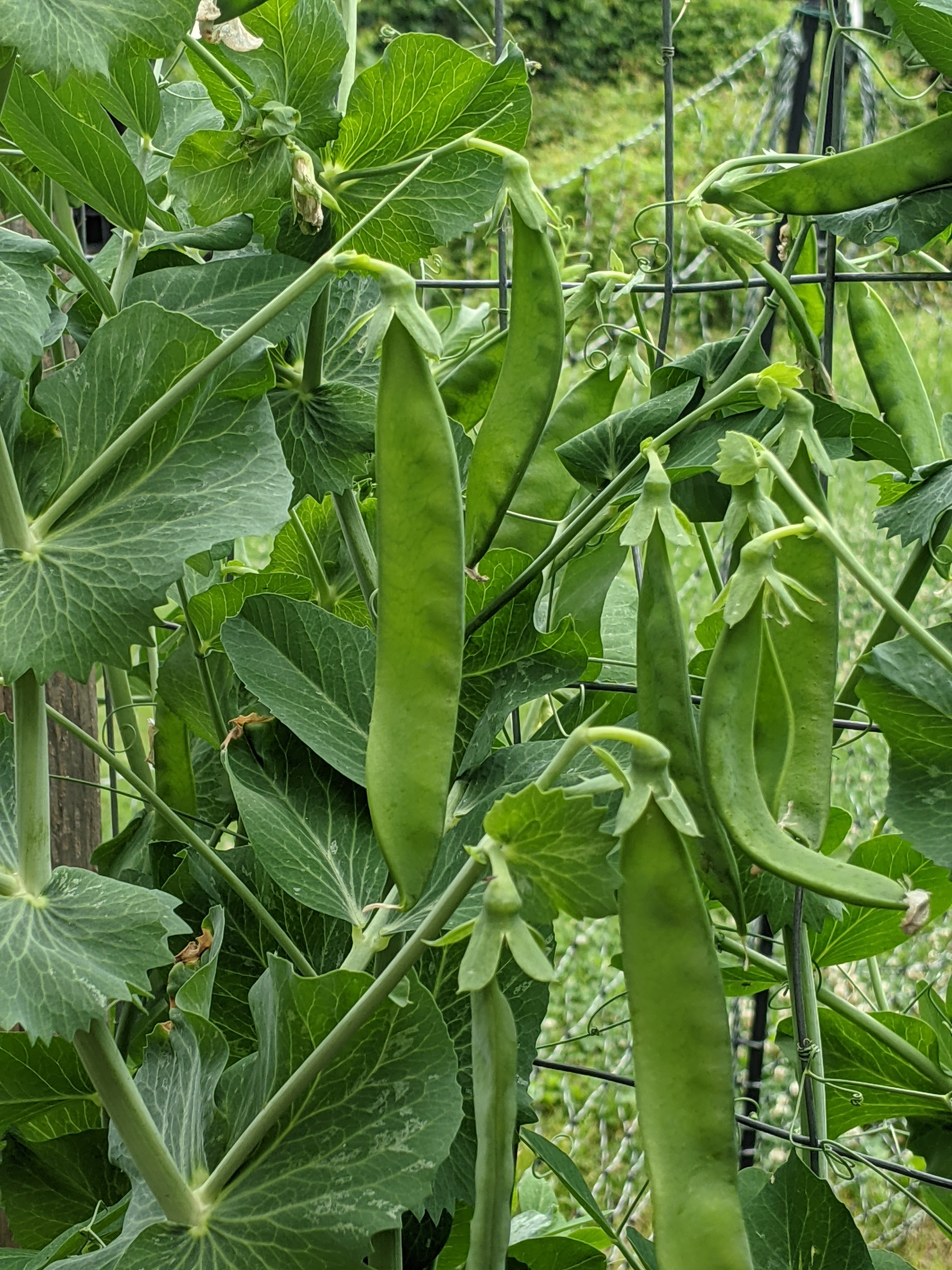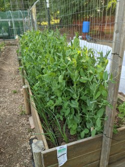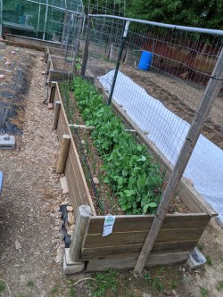 Peas were planted in a raised bed with a trellis and drip tape. Onions were also added to use as spring onions. The peas needed some string to keep them growing towards the trellis and we had one seriously bad storm with high winds that did blow them around a bit but all in all they did great.