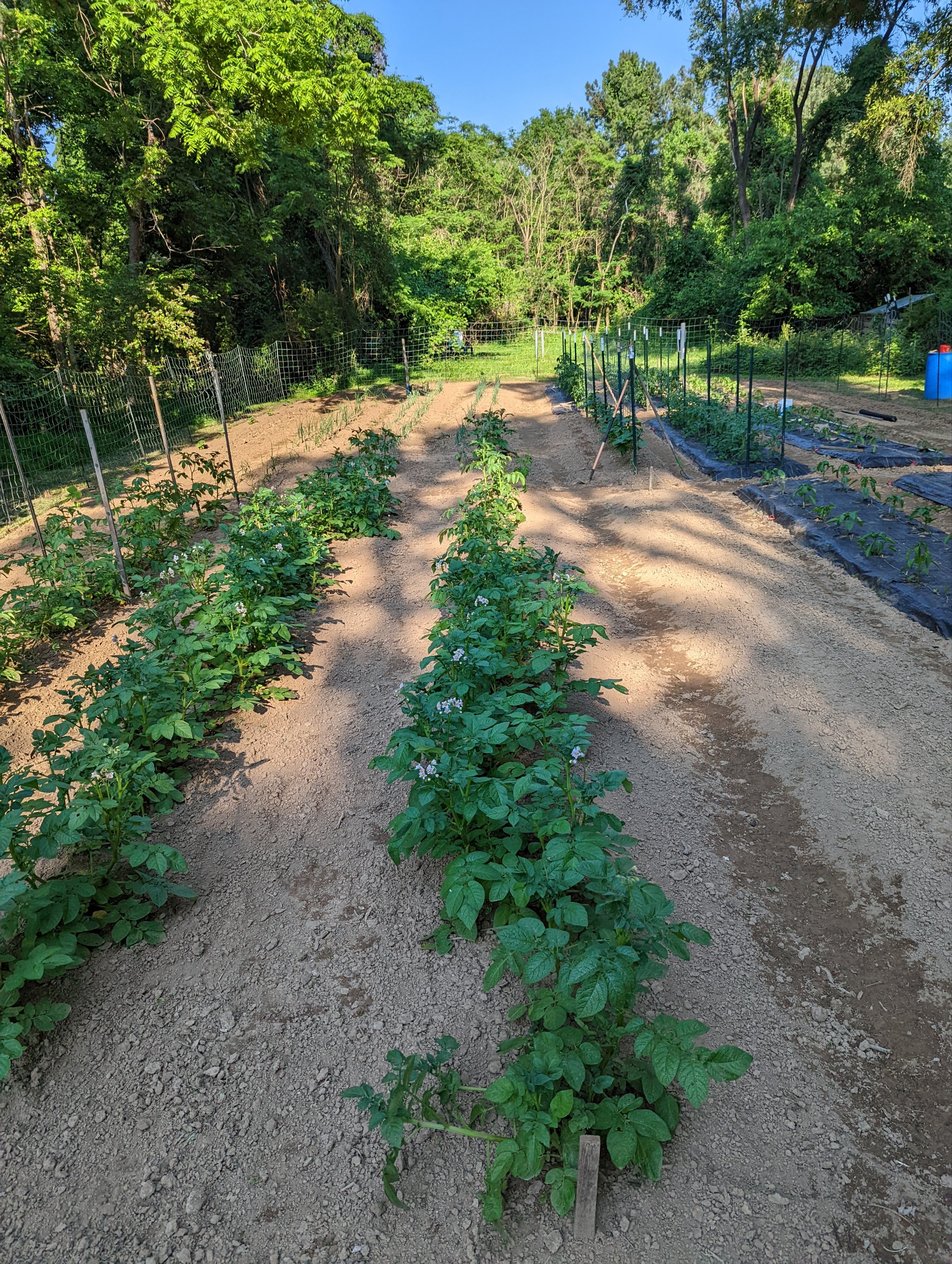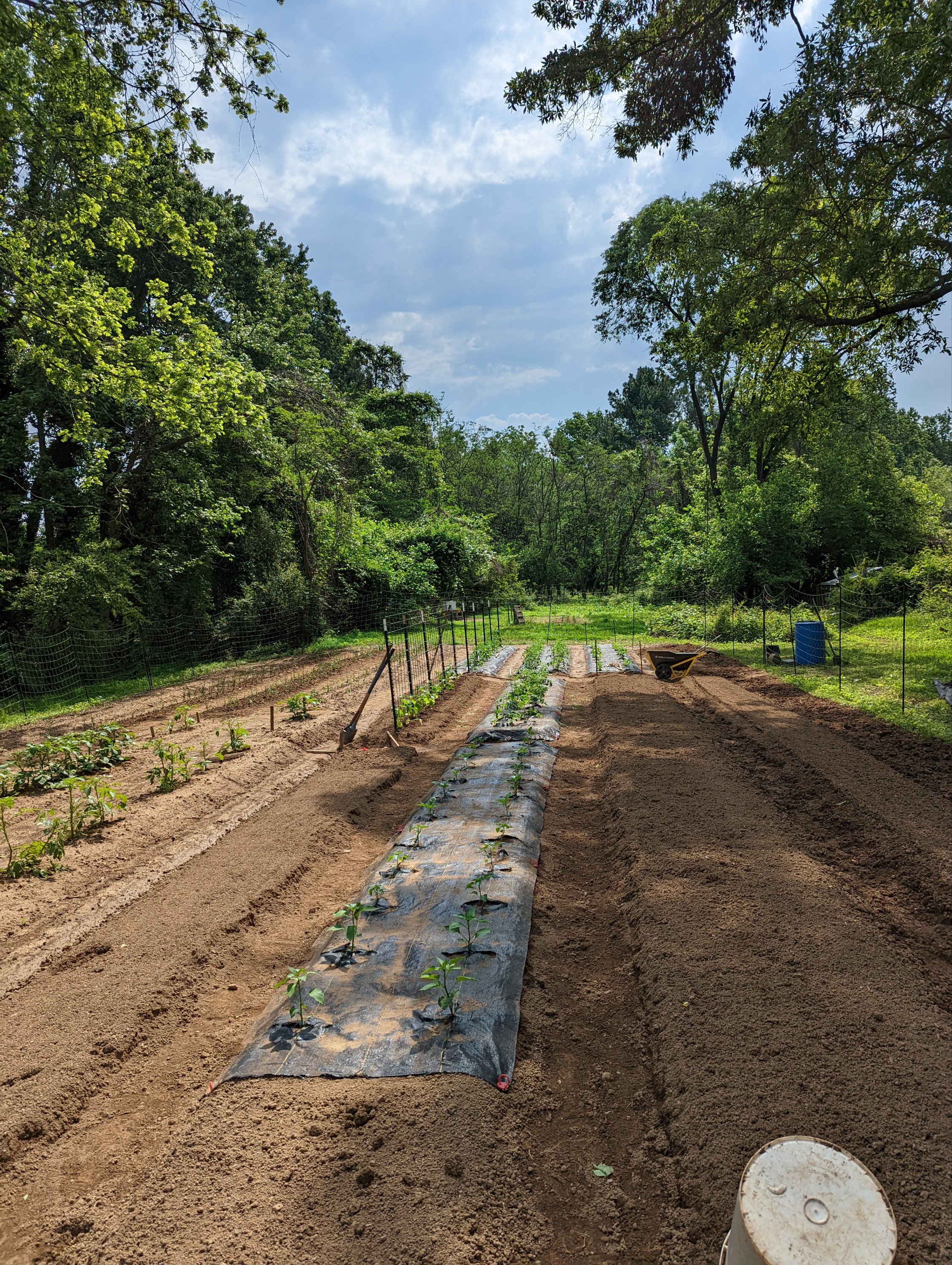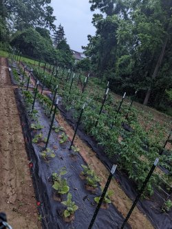 BeforePrepping for the tomato plants. Landscape fabric down. Tomatoes, peppers, and eggplant Onions and potatoesSecond section with Roma tomatoes and cucumbersRoma tomatoesPeppersPlants are growingT posts up for the Florida weaveT posts for the Florida weave on the Roma tomatoesT posts up on the beefsteak and slicing tomatoesPotatoesFlorida weave on the beefsteak tomatoMost of the garden is planted. Now the Florida weave has to be maintained by adding string as the plants grow.
